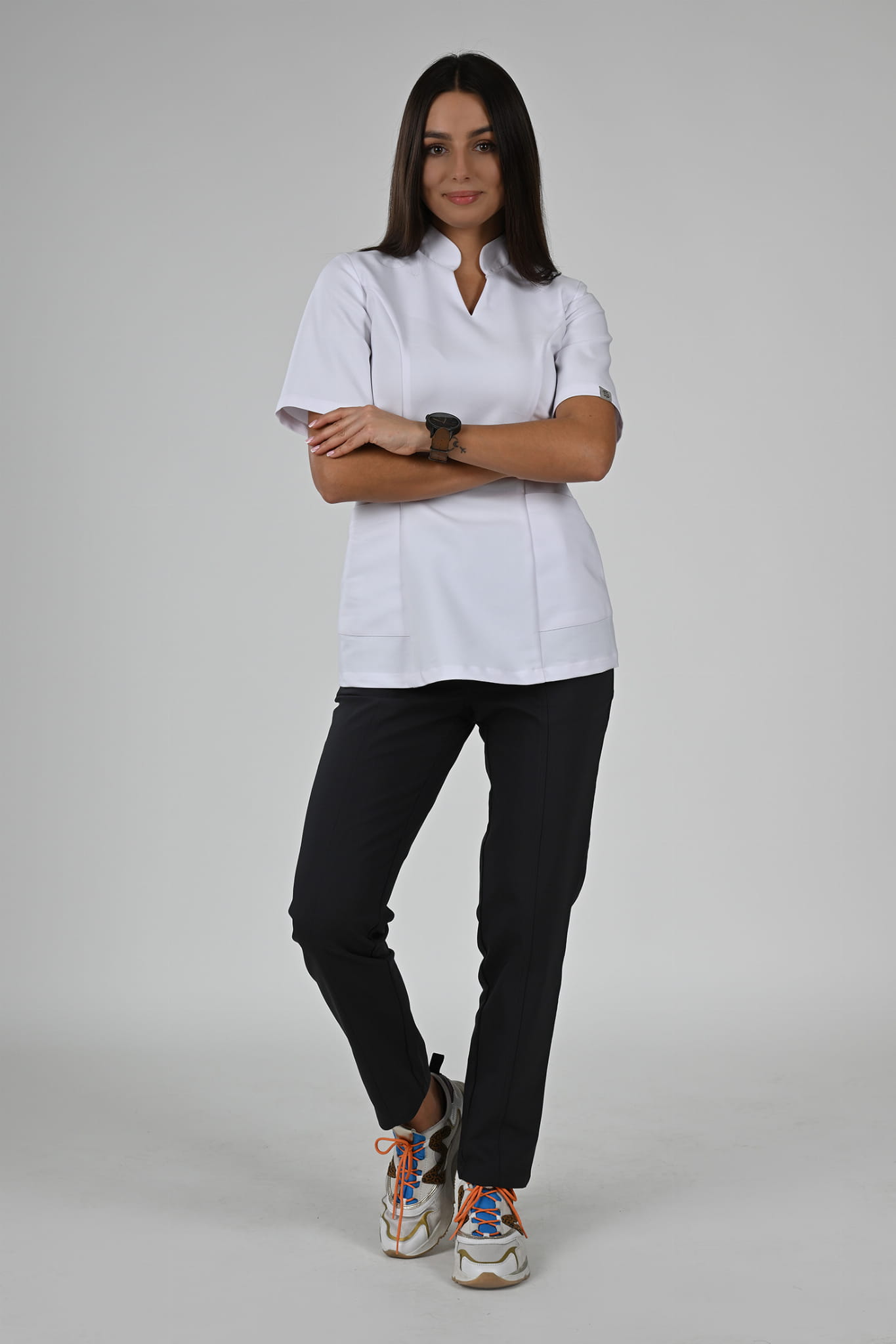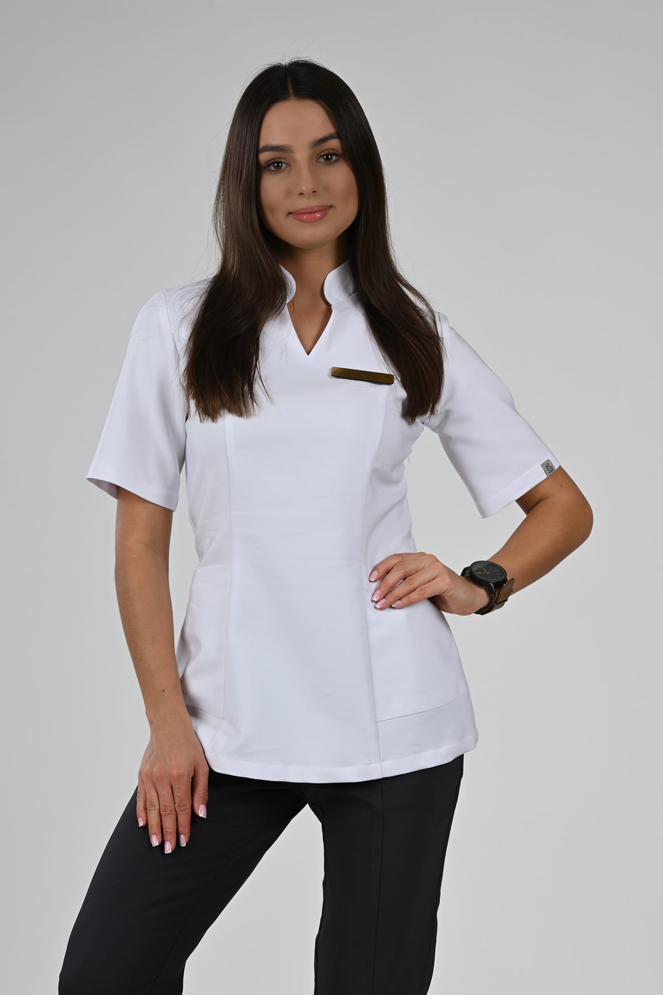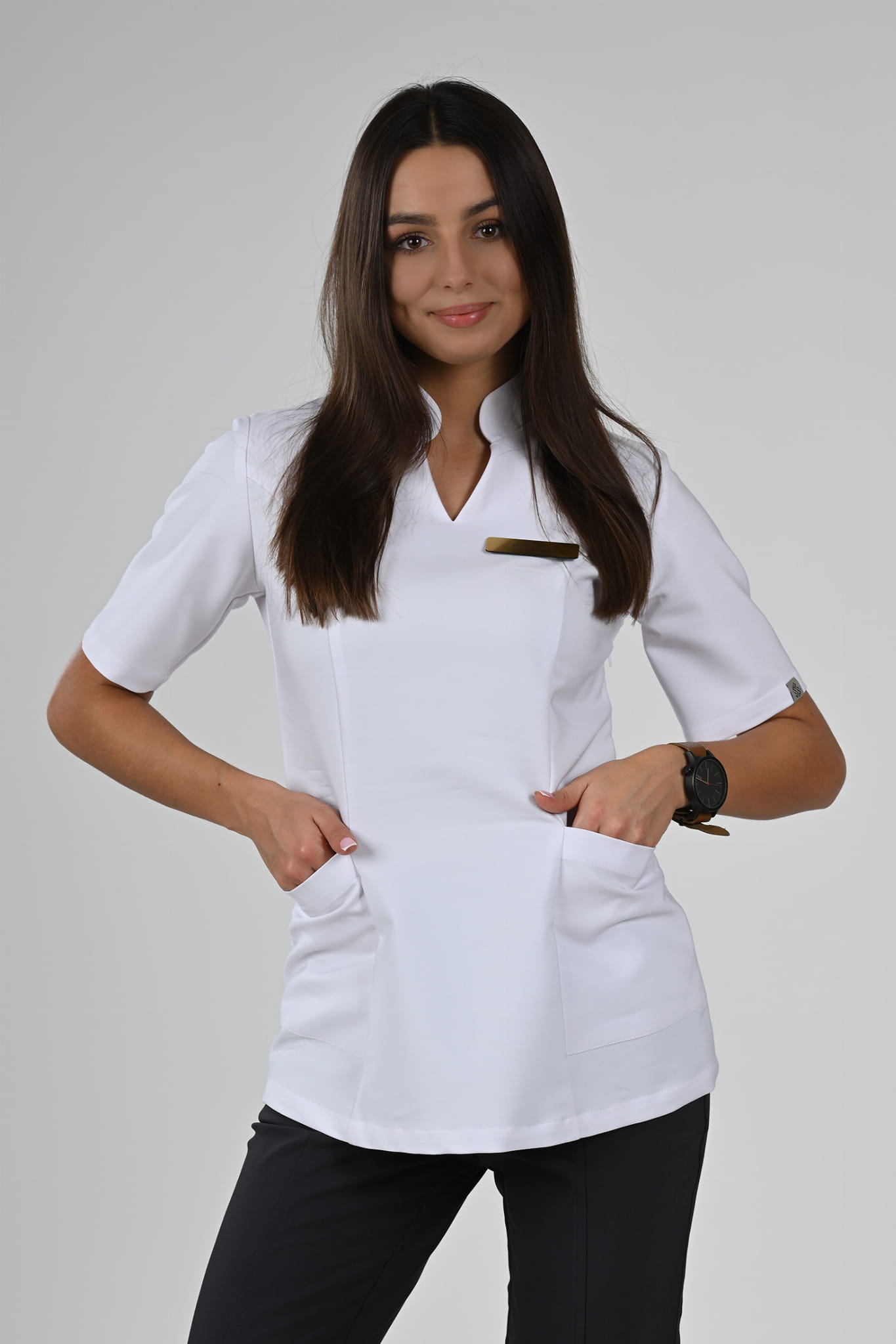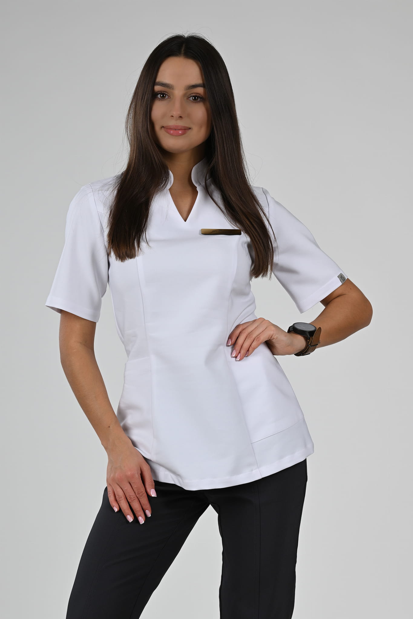 Poznaj kolekcję medycznych bluzek Premium Scrubs z elegancką stójką.